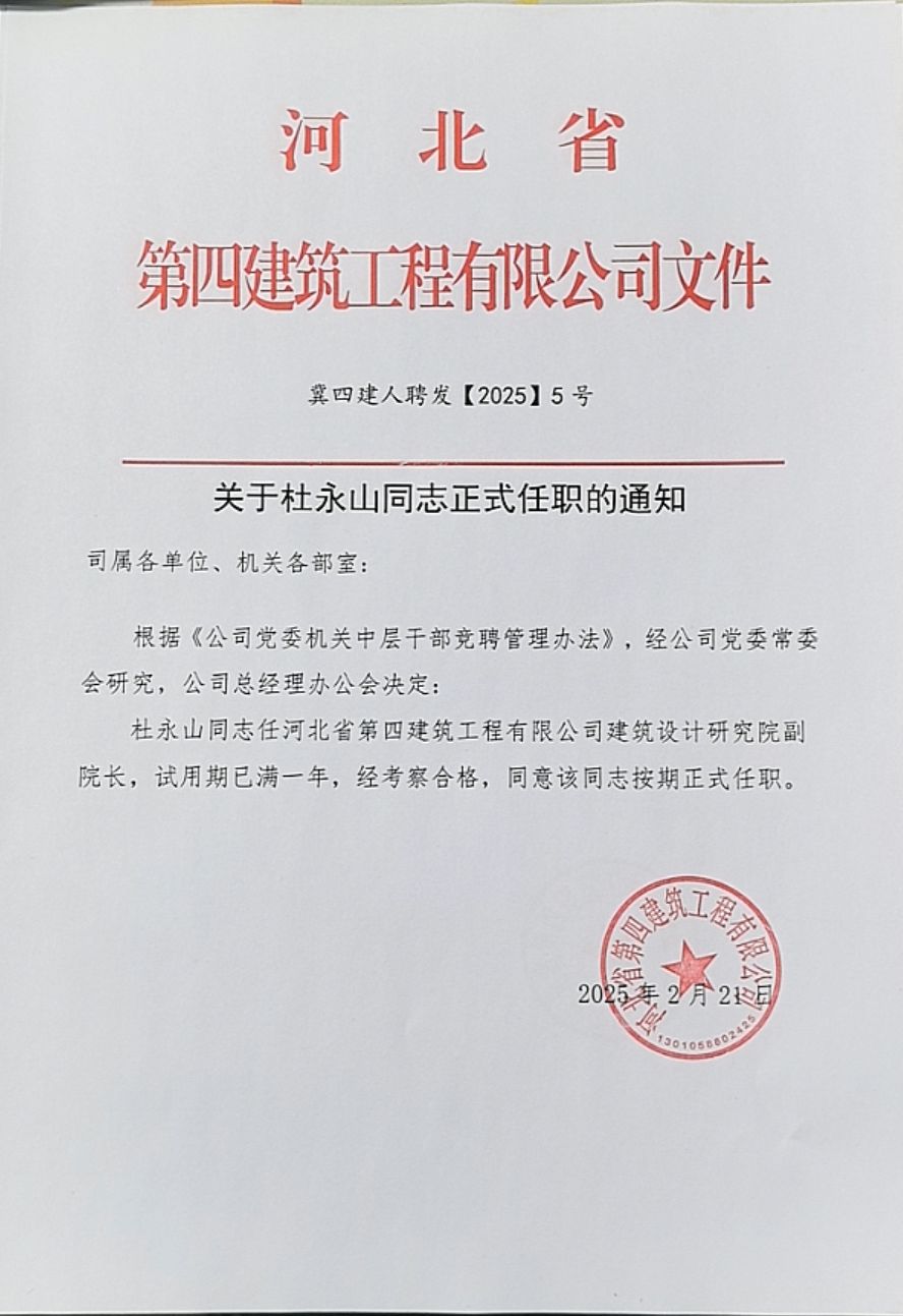 关于杜永山同志正式任职的通知